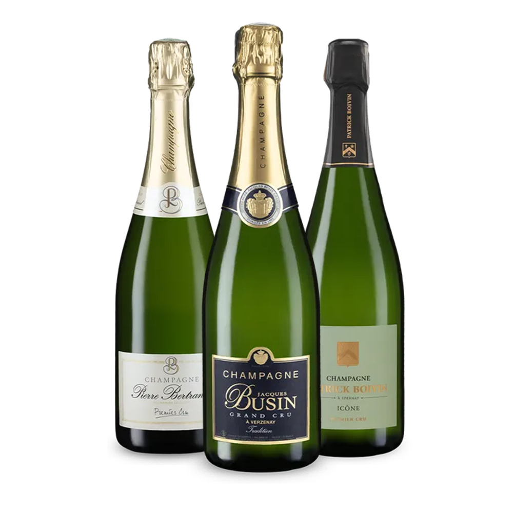 Elegante cru-champagnes om mee te proosten: ontdek de drie high-class mousserende wijnen van Jacques Busin, Patrick Boivin en Pierre Bertrand – nu voor een onweerstaanbare prijs.